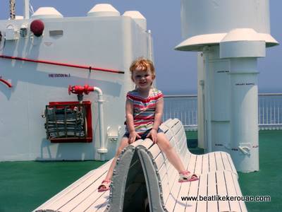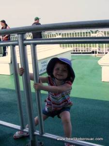 In addition, ferries also have advantages to the traveling family. Lily certainly had a blast running round the upper decks, playing with the other children, leaning out over the rail and contemplating a triple twist, one and a half somersault dive into the muddy Delaware Bay. Parents, in between halting their children’s first tentative steps towards Olympic diving stardom were free to stroll around, stretch their legs and enjoy my two favorite weather conditions, warm sun and cool breezes. On the whole it was a wonderful way to arrive in a new place and put me in a new frame of mind when contemplating the “First State in the Union.” In preparing for our upcoming adventure it did however leave me thinking; would I have the same butterflies in my stomach, the same frisson of excitement (as Bill Bryson would say) upon arriving in say, Rome, by airplane as I would taking a ferry out to the Greek Islands? Perhaps, but I like to think that travel is about the journey as much as the destination, and if that journey comprises only of being locked in a steel coffin with 650 other assholes then perhaps it is time to reconsider our chosen forms of transport. I’m just sayin’!