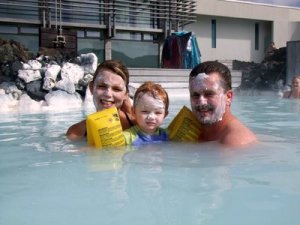 Once we’d tackled the challenges of tourists (crowds aren’t bad if you go in the morning) and the view (power plant decorating the horizon) the final score had to be settled by Lily, over how much time we could spend enjoying the hot water.   Up until very recently, our normally brave two-year old was happy to splash on a lake shoreline or dawdle on the top step of a pool, but when it came to actual swimming, where her body was submerged and her feet couldn’t touch, she had a tendency to panic, refusing to go in above her knees.  The past few months in the sweltering heat of Tennessee has allowed Lily to upgrade her swimming skills, if for no other reason than sheer comfort.  Not being in the water on a 95 degree day with 100 % humidity is impossible.  So after a few visits to my friend Abby’s pool and some jumps off the back of the boat on Fort Loudon Lake, she was prepared for the swimming.  We knew we still ran the risk of her crying and refusing to get in, but it was worth the chance.  I first tested her a bit by putting her under the overhead shower in the ladies’ locker room.  Whether she truly didn’t mind the mandatory pre-dip shower (Icelanders are very protective of the cleanliness of their hot pools) or was simply shocked by all the wobbly-bodied, European old ladies walking around in the nude, she was encouragingly cooperative.  To encourage her further, we told her it was a WARM pool, and not a HOT pool (HOT of course, means ouch, danger, don’t touch) and she leapt in, completely happy!  We swam around with her for about 20 minutes before a frantic employee flagged us down and presented her with a complimentary pair of Blue Lagoon Iceland water wings.  We found out later the water wings were mandatory for kids her age and I’m still not sure if they were truly complimentary or just a loaner pair, but I can tell you they will be reappearing at pools and beaches across Europe in the next few months.