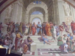 Like Michelangelo, Raphael got a bunch of work from the church in those days, and it was one of his paintings I really wanted to see. In fact, while Michelangelo was up on his scaffolding in the Sistine Chapel, Raphael was working on the Pope’s personal apartment down the hall. Not content to just give him three coats of ecru in a semi-gloss, Raphael undertook to cover the walls and ceilings of several rooms in an array of topics every bit as staggering as those in the Sistine Chapel. One of these, called The School of Athens, has been one of my favorites since an intoxicated lecturer at LaTrobe University showed it to me fifteen years ago. Meant to sum up everything that was going on in the Renaissance, The School of Athens depicts major thinkers from Ancient Greece (and a few others) in a huge wall space twenty feet across. In the center stand Plato and Aristotle. Plato points to the sky as if to say, “Hey bro, the answers are all in ideas and free thinking.” While Aristotle, Aristotle (he was a bugger for the bottle – sorry I had to say that) gestures to the earth saying, “Yo it’s all empirical man, concentrate on the facts, forget that hippy shit.” Off to the left side, Socrates (SO – Crates) counts his arguments, “All we are is dust in the wind, dude.” Anyway, the perspective of the painting is astounding. Architecture, floor design, even other figures depicted in the painting all are arranged to draw the observer’s gaze to the two central figures. Apparently one day, while popping out for a smoke, Raphael dropped by the Sistine Chapel to check up on Michelangelo. Standing there looking up at what was being created on the roof Raphael must have grudgingly said, “Good on ya mate, she’s a bueat!” Shortly thereafter Raphael added one more figure to his “School of Athens”, a depiction of Michelangelo sulking in the bottom of the painting.