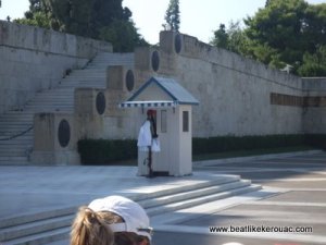 In order for Lily to endure the long, crowded bus ride into Athens a little bribery was required. After Windsor Castle and the Vatican’s Swiss Guard, lollipops, episodes of “Sid the Science Kid” and her puppy-dog, come second to the possibility of seeing a new set of soldiers. For anyone familiar with Lily’s latest obsession, let’s just say we, as her parents, are very concerned that she may one day run off with a man in uniform. The latest set of soldiers over which to continue this obsession are the evzones or Greek guard. Their dramatic uniforms, complete with flouncy sleeves, red hats, “pompoms on their boots!” and slow, rhythmic stomping (I’d have to agree with Lily) might be the best changing of the guard yet.