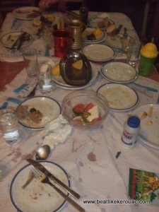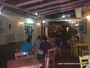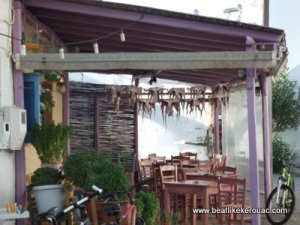 “Let’s go look at his fish!” announced Jens, as the cephalopod course was nearing an end, and he leapt up from the table and gestured for me to follow him into the kitchen.  From a cool box, the owner proudly pulled his catch of the day.  Holding up mackerel, whitebait, sardines, gopa, marida and mullet, he gestures that we should choose.  Jens, by far the more experienced Greek kitchen eater, chooses one of the mullet and I pick a healthy portion of whitebait.  The mullet comes to us grilled on charcoal and marinated in lemon. The whitebait, battered and fried.  We eat the whitebait like little potato crisps, picking them up by the tail and eating everything, head, bones, the lot.  As I carefully pulled the meat from the bones of the mullet, the fish eyes popped out onto the plate, “You want one of those?” I asked Jens.  Screwing up his eyes as if to say “what sick bastard would eat an eyeball?”,his expression was incredulous.  There was no way to back down now so I picked up the eyeballs and quickly chewed, following them with the cheeks, rumored to be the best portion of the fish.  As long as you don’t think too much about the fact that fish actually have cheeks, I have to agree they were relatively tasty.  After recovering from watching my display of eyeball consumption, Jens joined in attacking the mullets, leaving nothing but the backbone, ribs and head for the waiter to remove.