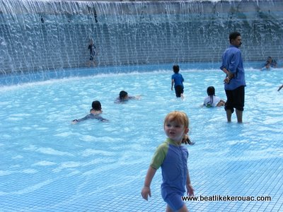 Let me point out now that in both Abu Dhabi and here in Kuala Lumpur, there are plenty of people dressed in typical Western fashion, just like me, so we didn’t stick out in that way.  Although here, I began to notice that most of the non-Muslim people around us were Chinese, and the Caucasian person more of a rarity.  Even rarer is the Caucasian child.  Even rarer still is the Caucasian child with red hair and blue eyes – henceforth began Lily’s status as the Golden Child.  It began when we first decided to pry ourselves out of the air conditioned hotel room and give Lily a chance to run around on the playground.   When traveling with a small child, finding a playground in your vacation city is always a necessity, and some cities do it better than others.  The playground in the Golden Triangle of Kuala Lumpur is probably the most extensive I’ve ever seen, complete with wading pool and gushing play fountains.