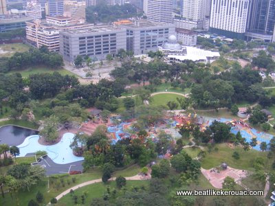 This hotel, with its shoe shine kit in the cupboard, pillow menu (firm, medium, or soft – available from room service), and top deck pool bar with complimentary cocktails and two hot tubs (of varying temperatures) was the bee’s knees, and the perfect way to spend the last days of our extended voyage.  We were ready to peruse the city at a leisurely pace, keeping our final days relaxing and comfortable. Although we took a walk in the hooker-murdering neighborhoods around lunchtime and rarely saw anything more dangerous-looking than an old man selling bags of durian fruit from a food stall, we were happy to be staying in the Golden Triangle, the posh new neighborhoods of Kuala Lumpur that consists of nice hotels, extensive well-groomed parks, and air-conditioned malls, all circling the famous twin Patronus Towers, which enjoyed a brief stint in the late 90’s as the world’s tallest buildings.  We were bummed that the Towers were closed until December for renovations, but were instead able to go up another ear-popping elevator to the top of the space-needle looking KL Tower, which gave us a 360 degree view of the city (including a good one of the Patronus Towers, which we wouldn’t have seen at all if we were up in them, of course) and a thorough audio guide to go with.   The observation deck and first floor of the KL Tower also housed a number of tacky souvenir stalls and a small but ok cultural center and mini-zoo, so although we didn’t get to any authentic Malaysian markets, I was able to stock up on floral print sundresses and glittery scarves and get a bird on my head, so it didn’t disappoint.